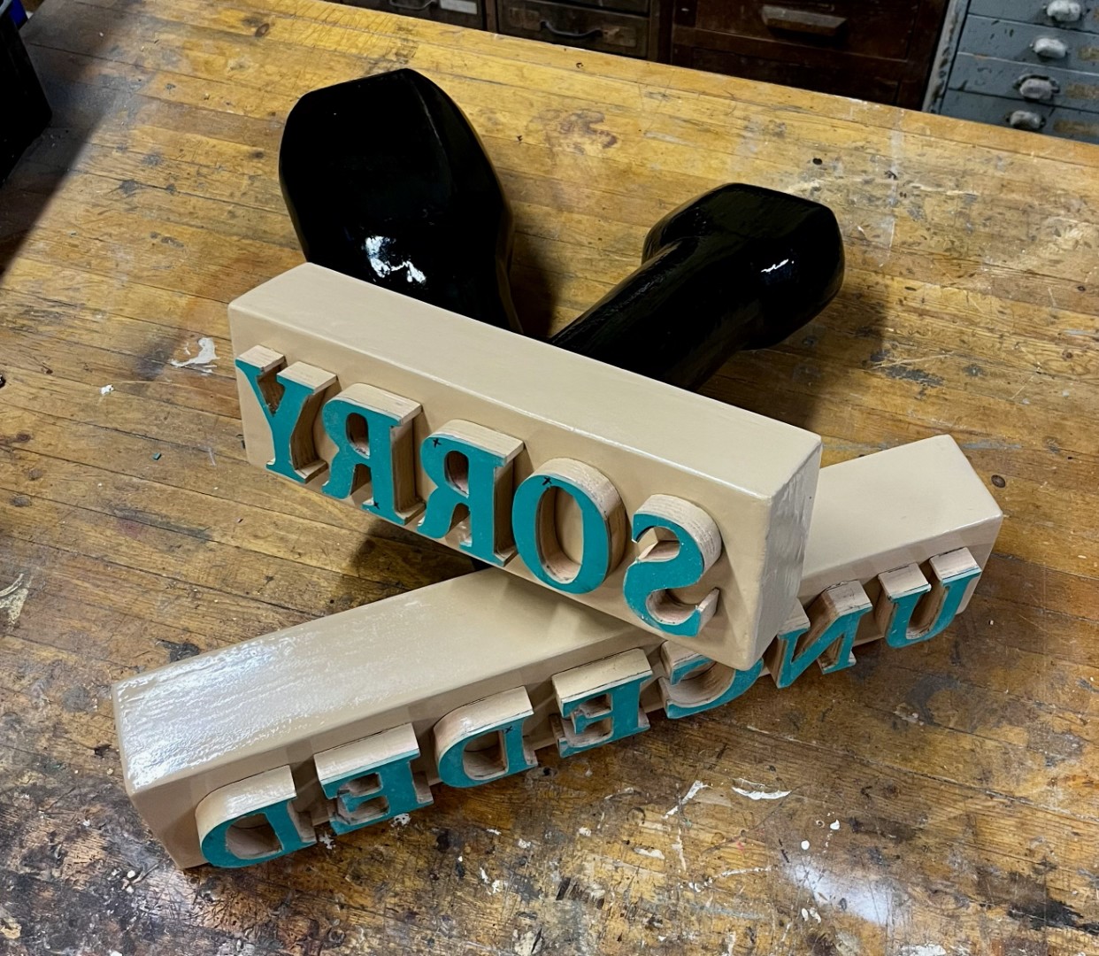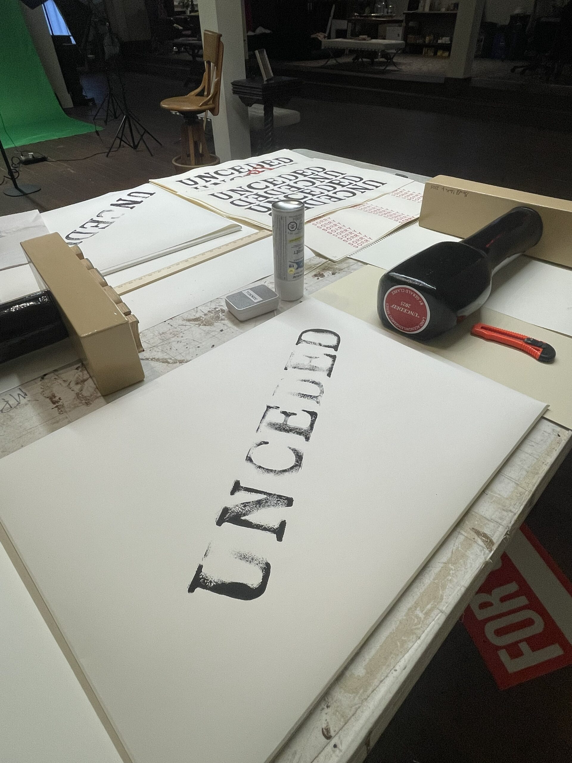 The maquettes were carved out of Styrofoam, then coated with resin and painted. The letters are made of wood and covered with linoleum to enable me to use them to print. The Unceded maquette is 22.5”x 24.5”x 5” and features a vinyl label identifying the title, date and series name. The Sorry maquette is 15”x 20”x5” and also has a vinyl label identifying its title, date and series name.