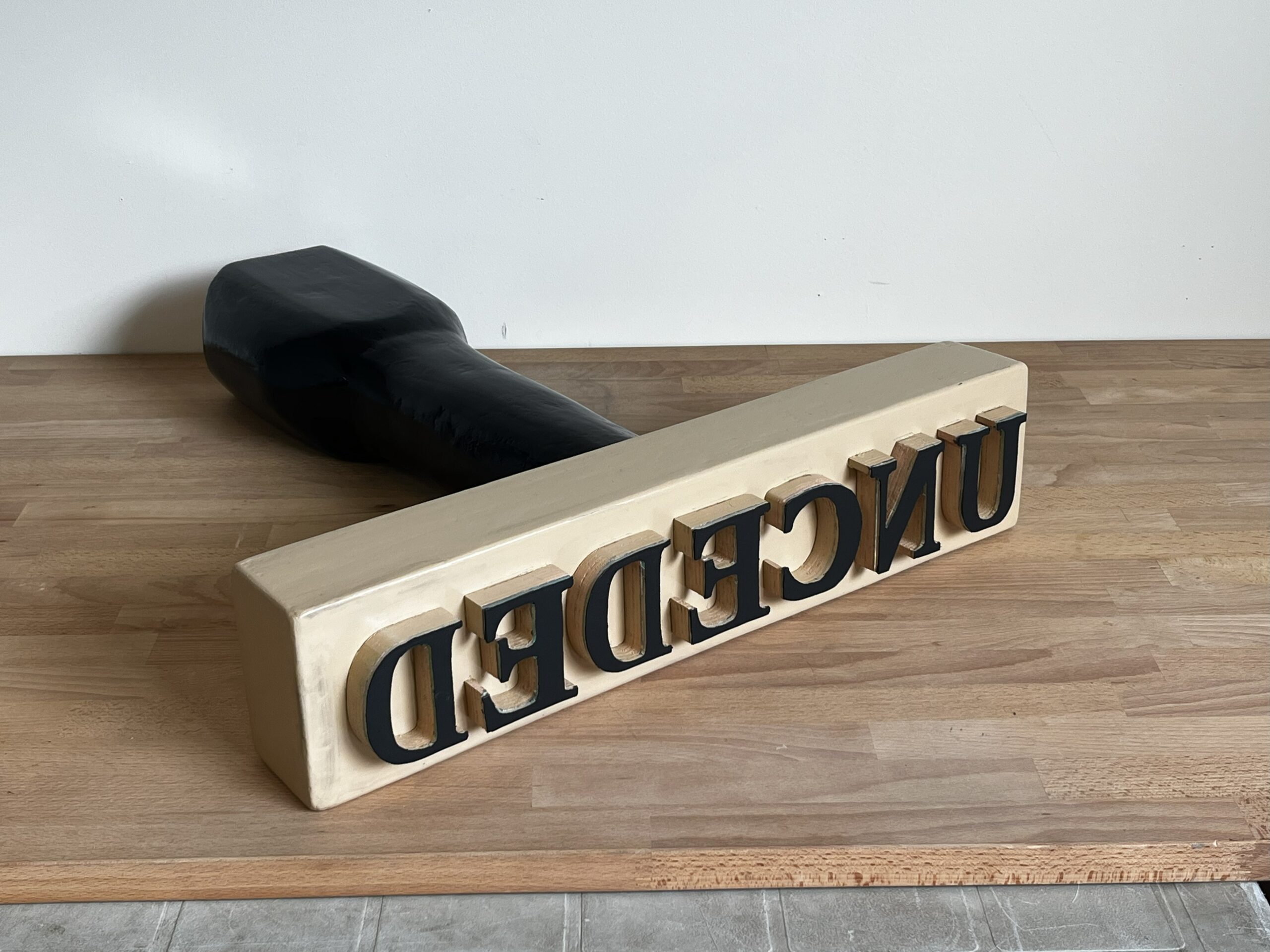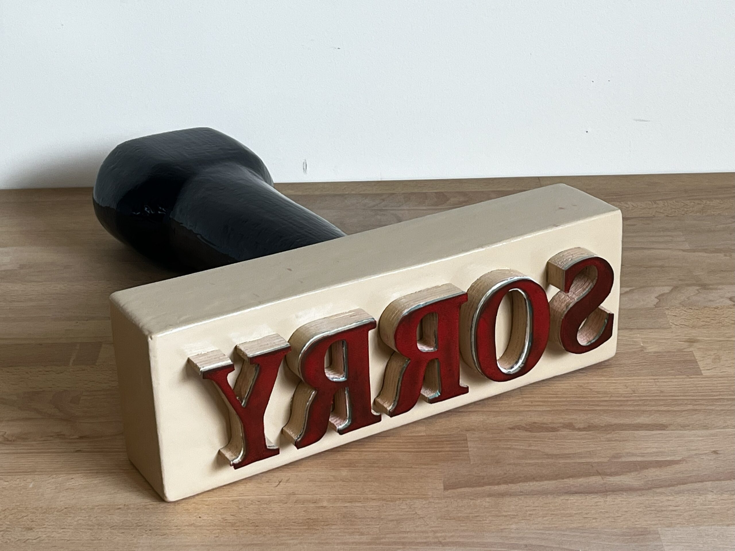 Accompanying the Unceded maquette is a smaller rubber stamp maquette featuring the word ‘sorry’. As a rubber stamp, it too lacks emotional connection and becomes meaningless.