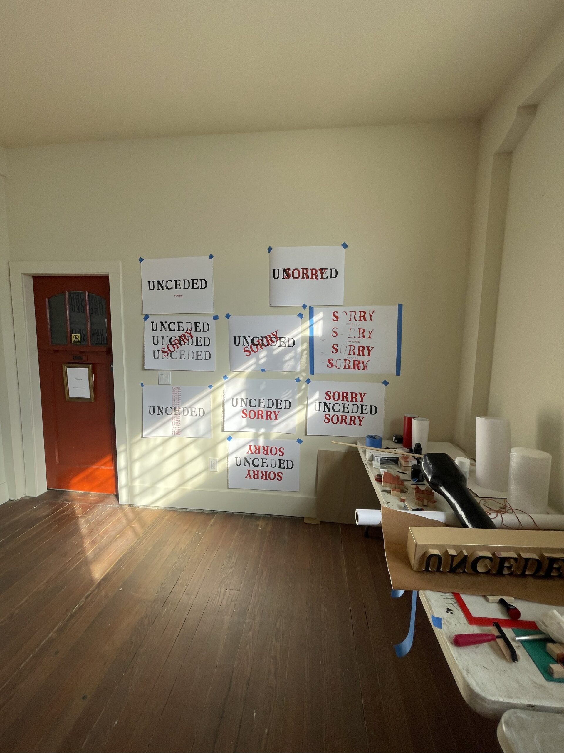 To further investigate the possibilities of this series, I used the maquettes to make relief prints. I used black ink on the Unceded maquette and red ink on the Sorry maquette and combine them in various ways to create prints that represent what I’m expressing through the series. I feel that both the maquettes and the prints offer the opportunity for viewers to reconsider the words, their context, and their histories involving settler governments, relationship, and the treatment of Indigenous people.