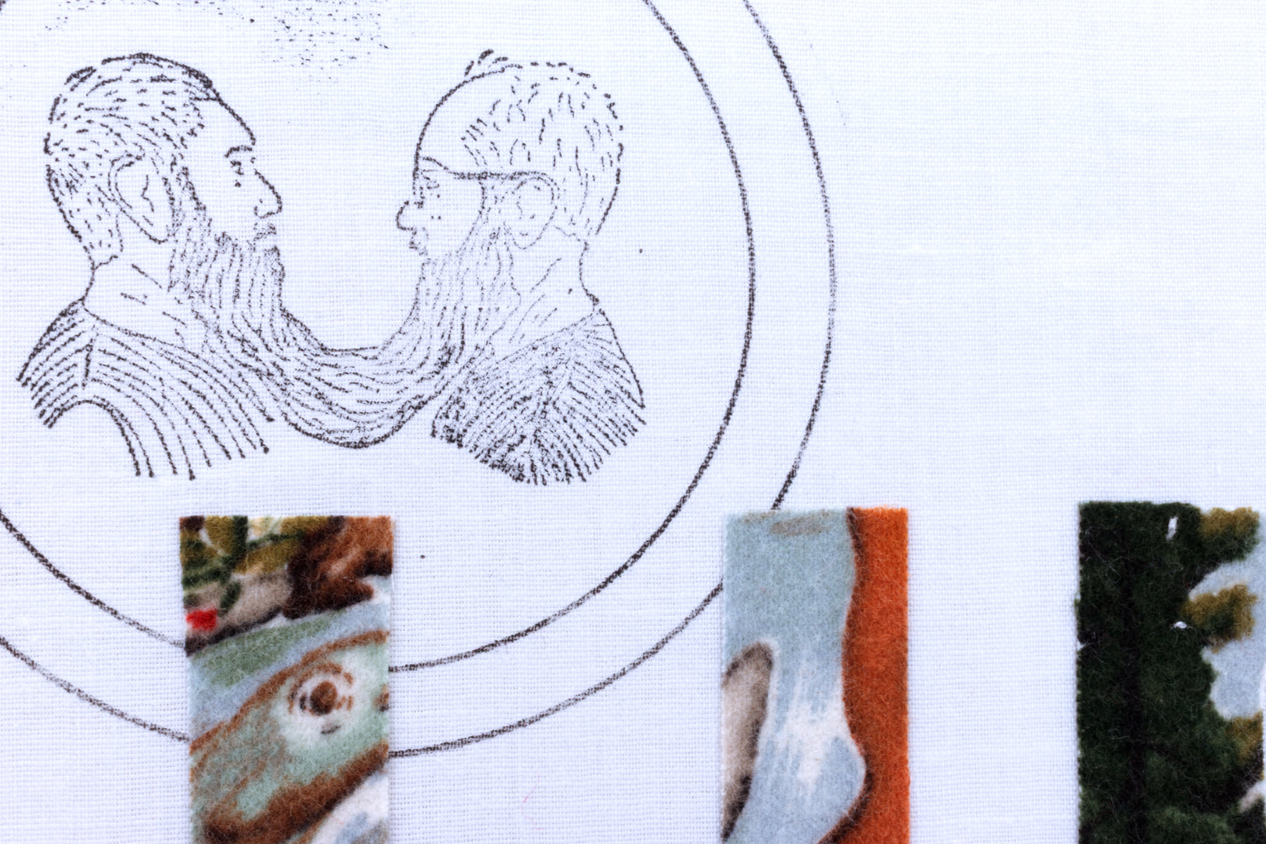 collage textil, bordado a mano con hilos de algodon y estampa con sello sobre tela.